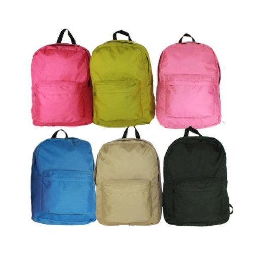 15"" backpacks. GREAT QUALITY MATERIAL!! One large main compartment great for all kind of storage, and one medium zip up pocket in front. Has padded back and straps. Backpack measures 15""H x 11""L x 5.5""W. 6 COLORS AVAILABLE!!!" Case Pack 24